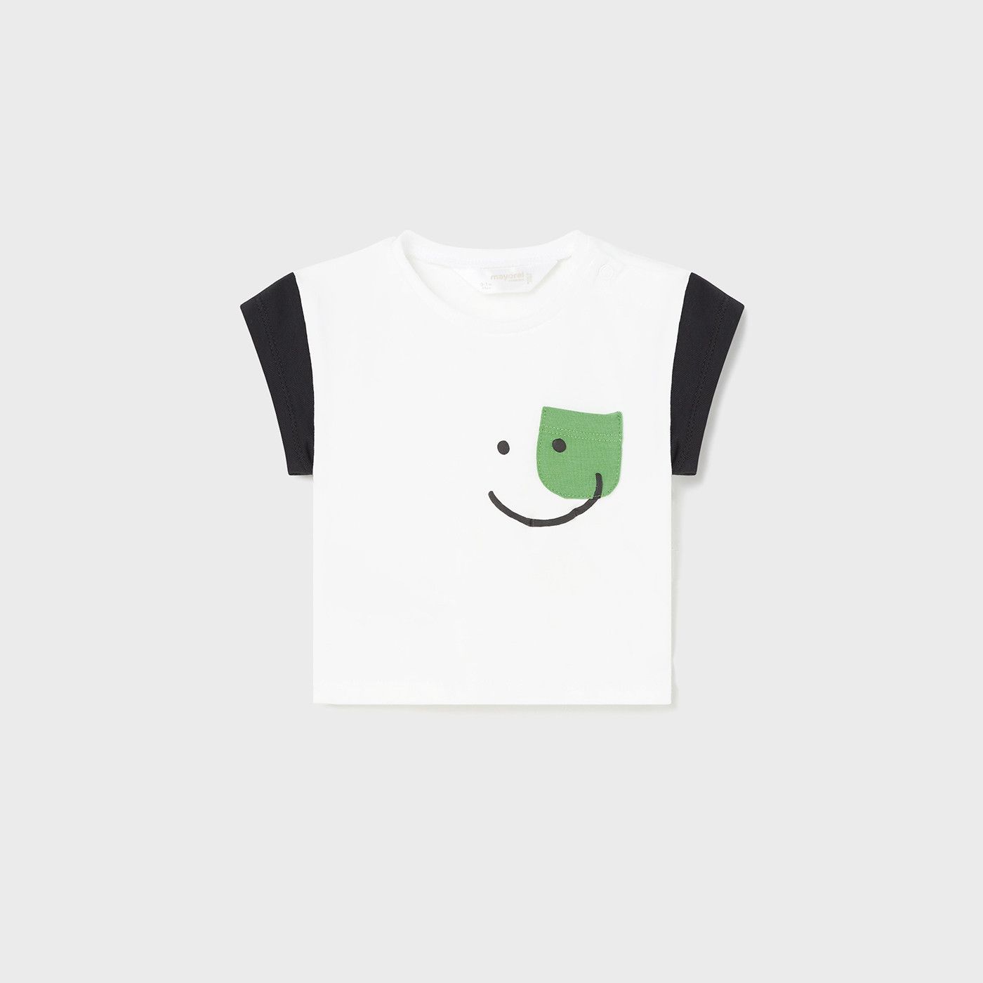 - Camiseta de manga corta para bebé, en color blanco, con cuello redondo, estampado infantil y cierre con botones a presión en el hombro para facilitar su puesta.