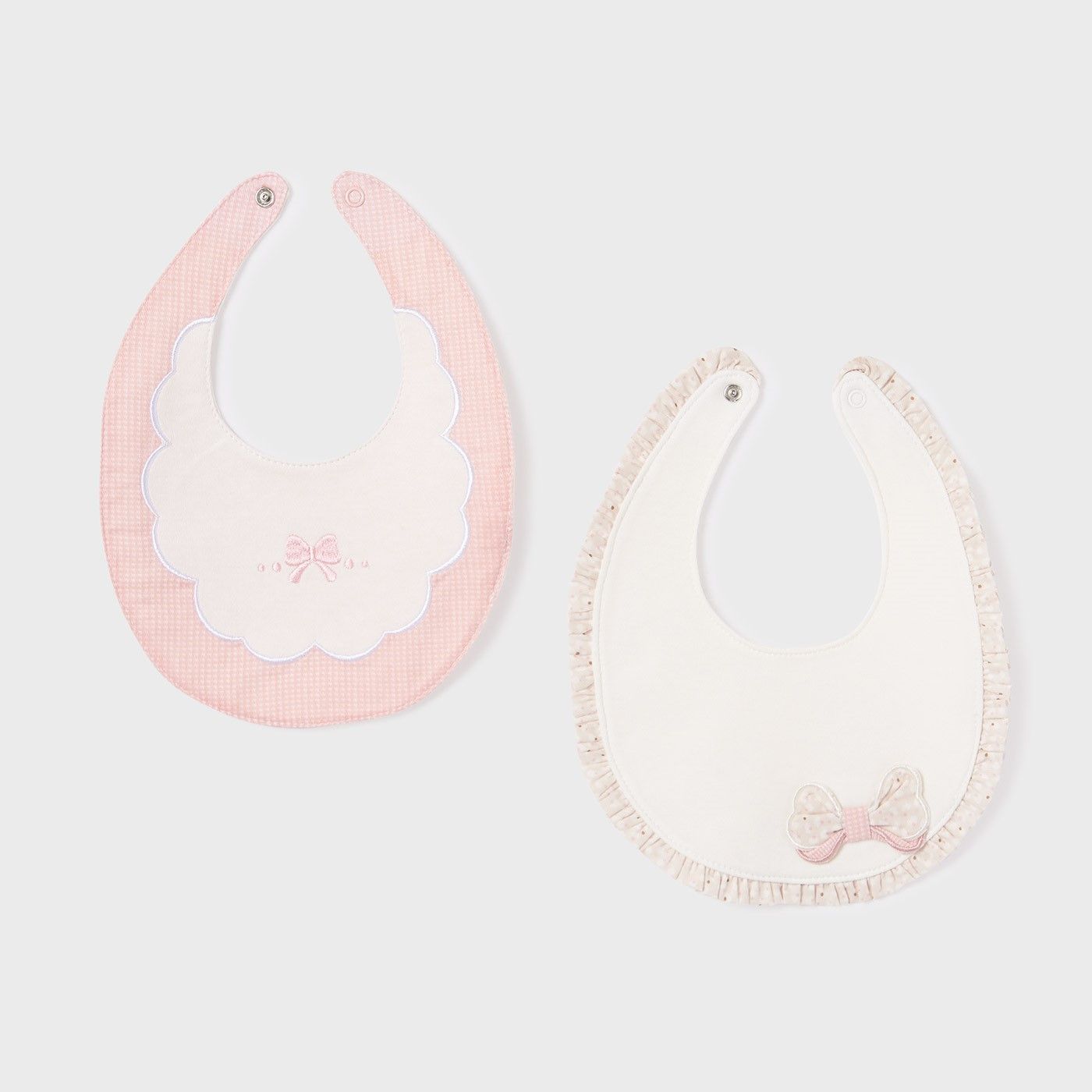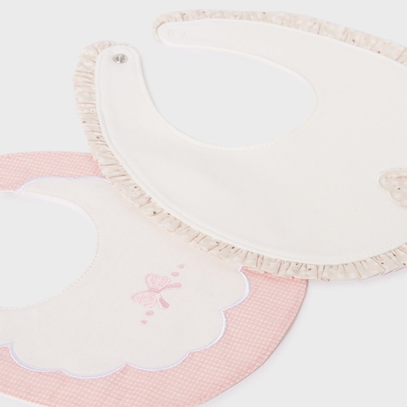 Set 2 baberos bebé recién nacido de la marca Mayoral, línea Ecofriends COTTON BETTER, de algodón sostenible 100% BETTER COTTON con bordados infantiles de lacitos y volantito fruncido, en color rosado. Los dos baberos para recién nacido cierran por el cuello con botón automático.